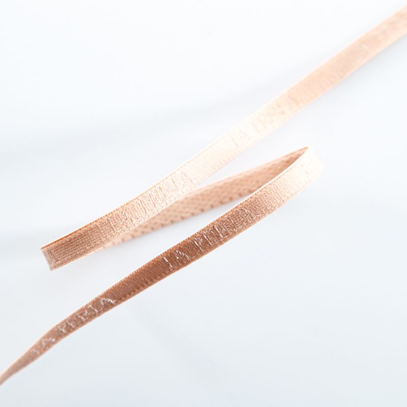 Бретелечная резинка используется для обработки стана бюстгальтера, а также для бретелей. Матовая с жаккардовой надписью бренда. Края ровные.