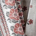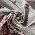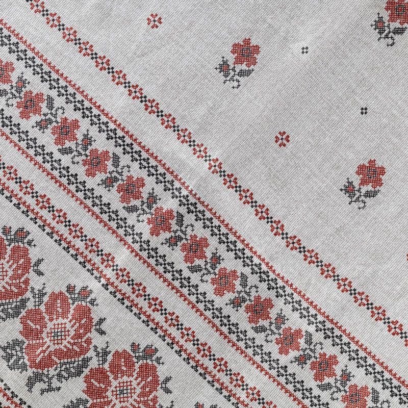 Ткань рогожка с набивным рисунком с имитацией вышивки крестиком на сером меланжевом фоне. Это плотная хлопковая ткань с переплетением нитей две на две, благодаря этому создаётся структурное полотно отлично подходящее для пошива скатертей и салфеток, фартуков, сценических костюмов. Набирается объемом.