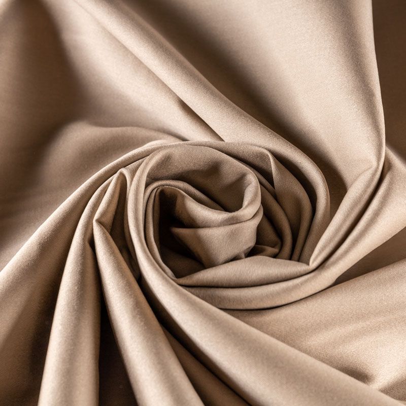 Поверхность гладкая со сдержанным блеском, ткань плотная, но не толстая, хорошо держит форму, тянется