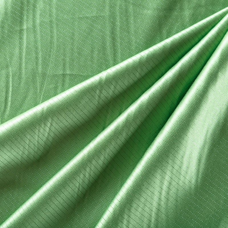 Сатин-коттон в зеленом оттенке с тонкими полосками люрексовой нити. Поверхность гладкая со сдержанным блеском, ткань средней плотности, не толстая, хорошо держит форму, тянется за счет эластана в составе. Подойдет для пошива костюма, жакета, юбки, платья, брюк или шорт.