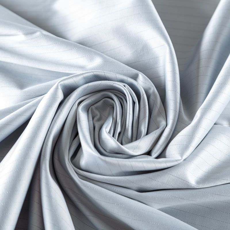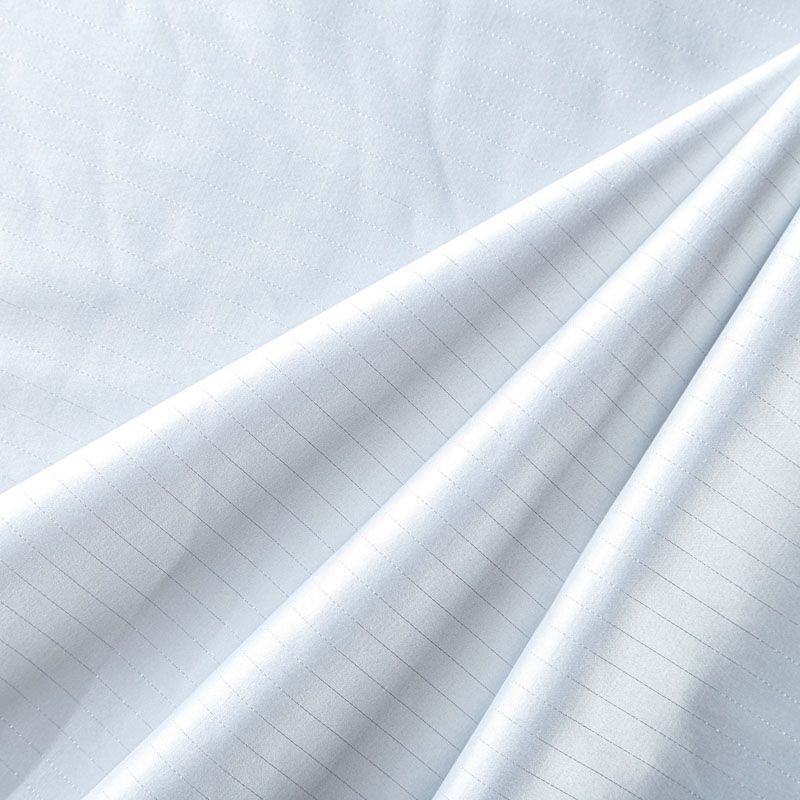 Сатин-коттон в белом оттенке с тонкими полосками люрексовой нити. Поверхность гладкая со сдержанным блеском, ткань средней плотности,  не толстая, хорошо держит форму, тянется за счет эластана в составе. Подойдет для пошива костюма, жакета, юбки, платья, брюк или шорт.