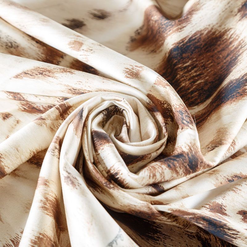 Итальянский сатин-коттон в молочном цвете с анималистическим принтом в природных оттенках. Поверхность гладкая со сдержанным блеском, ткань средней плотности,  не толстая, хорошо держит форму, тянется за счет эластана в составе. Подойдет для пошива костюма, жакета, юбки, платья, брюк или шорт.
