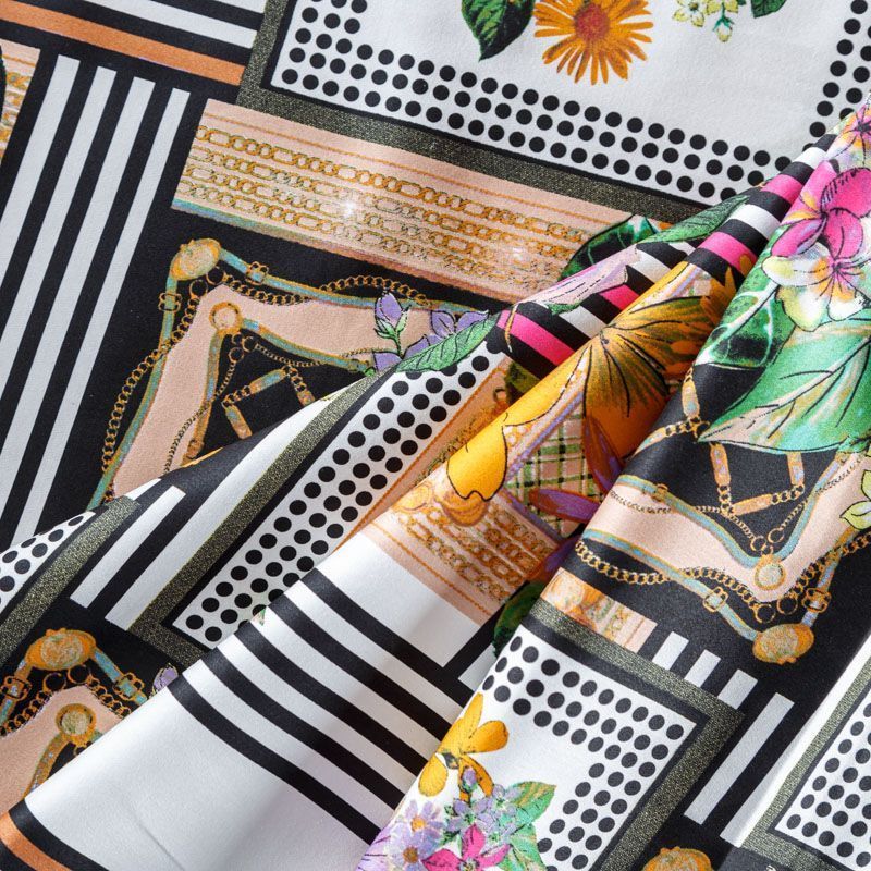 Сатин-коттон в белом цвете с абстрактно-цветочным принтом. Поверхность гладкая со сдержанным блеском, ткань средней плотности, не толстая, хорошо держит форму, тянется за счет эластана в составе. Подойдет для пошива костюма, жакета, юбки, платья, брюк или шорт.