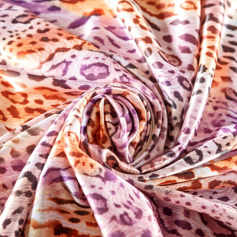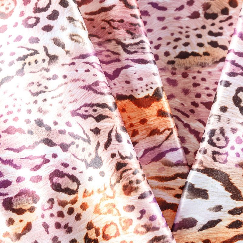 Сатин-коттон в сиреневом оттенке со стилизованным анималистическим принтом, с гладкой поверхностью со сдержанным блеском, ткань средней плотности,  не толстая, хорошо держит форму, тянется за счет эластана в составе. Подойдет для пошива костюма, жакета, юбки, платья, брюк или шорт.