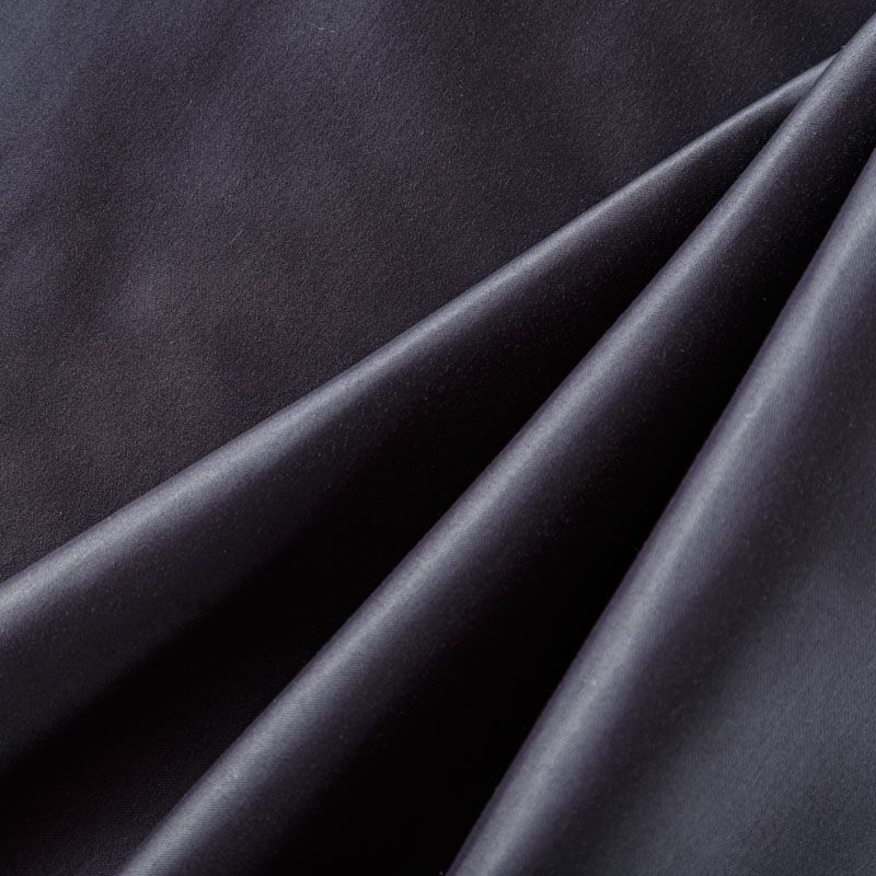 Сатин-коттон в черном цвете, с гладкой поверхностью со сдержанным блеском, ткань средней плотности, не толстая, хорошо держит форму, тянется за счет эластана в составе. Подойдет для пошива костюма, жакета, юбки, платья, брюк или шорт.