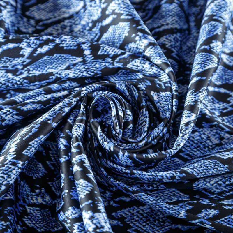 Сатин-коттон черного цвета со стилизованным анималистическим принтом, с гладкой поверхностью со сдержанным блеском, ткань средней плотности,  не толстая, хорошо держит форму, тянется за счет эластана в составе. Подойдет для пошива костюма, жакета, юбки, платья, брюк или шорт.