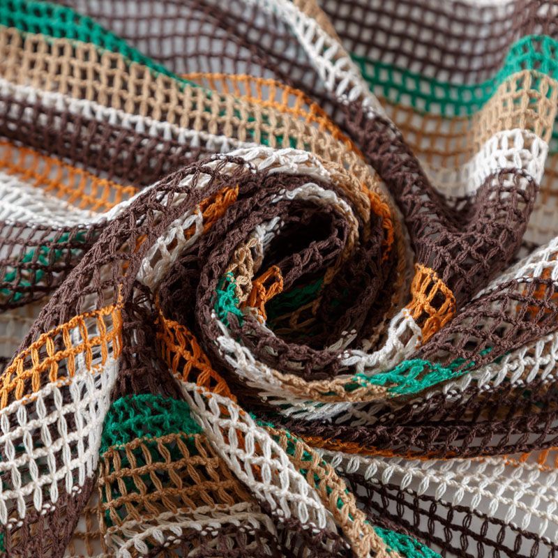 Вязаная сетка из натуральных хлопка в вертикальную цветную полоску.Форма ячейки - квадрат. Фактурный, пластичный материал, подходящий для создания эффектных образов: платья, юбки, брюк на подкладе, аксессуаров, сценических костюмов, пляжной одежды.