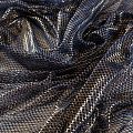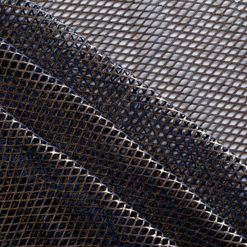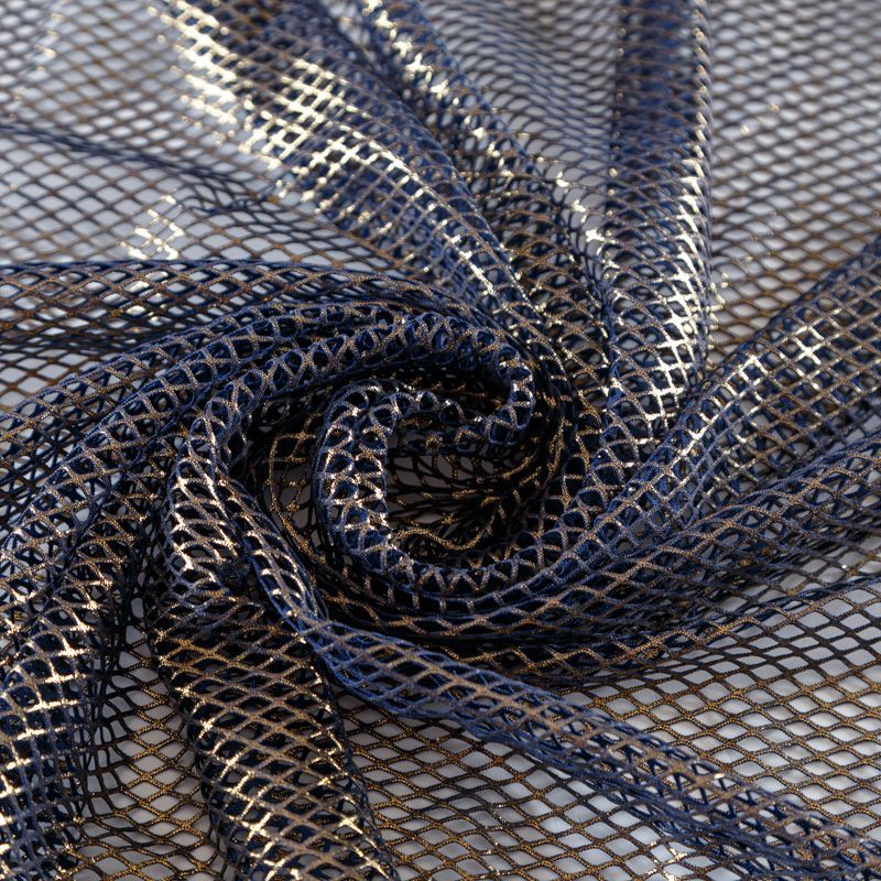 Рельефный полупрозрачный материал с сетчатой структурой. Поверхность полотна с металлизированным золотым напылением, которое придает материалу легкий блеск и мерцание. Полотно мягкое, растяжимое во всех направлениях. Сетки нашли свое применение в процессе пошива и последующего декора вечерних нарядов, свадебных платьев, спортивной одежды, театральных костюмов.