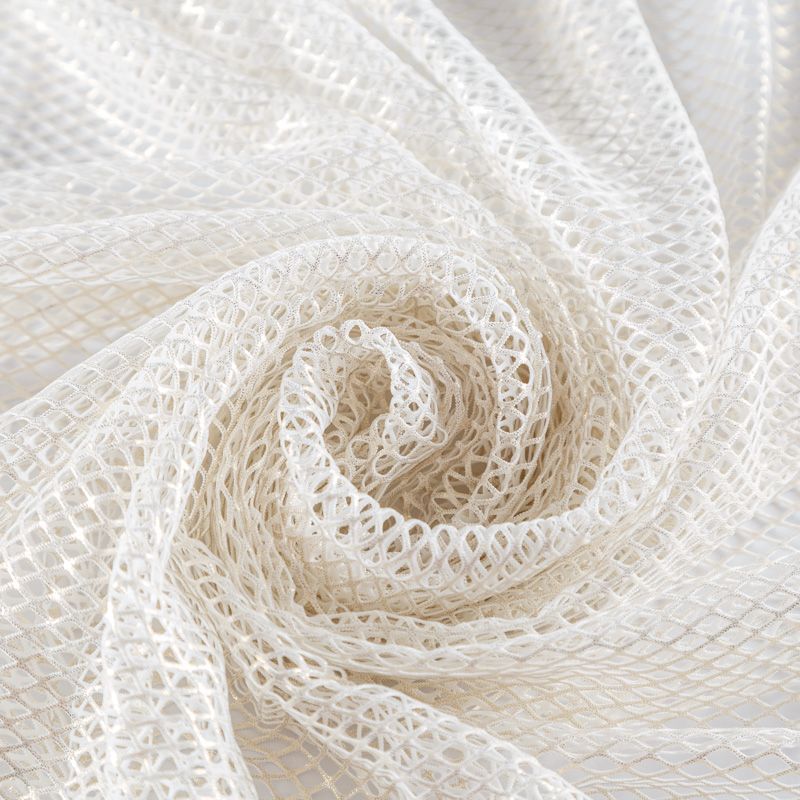 Рельефный полупрозрачный материал с сетчатой структурой. Поверхность полотна с металлизированным золотым напылением, которое придает материалу легкий блеск и мерцание. Полотно мягкое, растяжимое во всех направлениях. Сетки нашли свое применение в процессе пошива и последующего декора вечерних нарядов, свадебных платьев, спортивной одежды, театральных костюмов.
