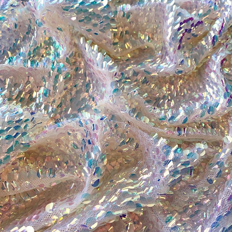 Тонкая эластичная сетка абрикосового оттенка по всей поверхности усеяна объемными глянцевыми "бензиновыми" пайетками. Ткань очень хорошо драпируется, красиво переливается, имеет глянцевый блеск, пластичная и эластичная и в длину, и в ширину, набираются объемом. Пайетки — идеальный материал для праздников и вечеринок. Из них получится эффектное платье, жакет, боди, туника, юбка или комбинезон.