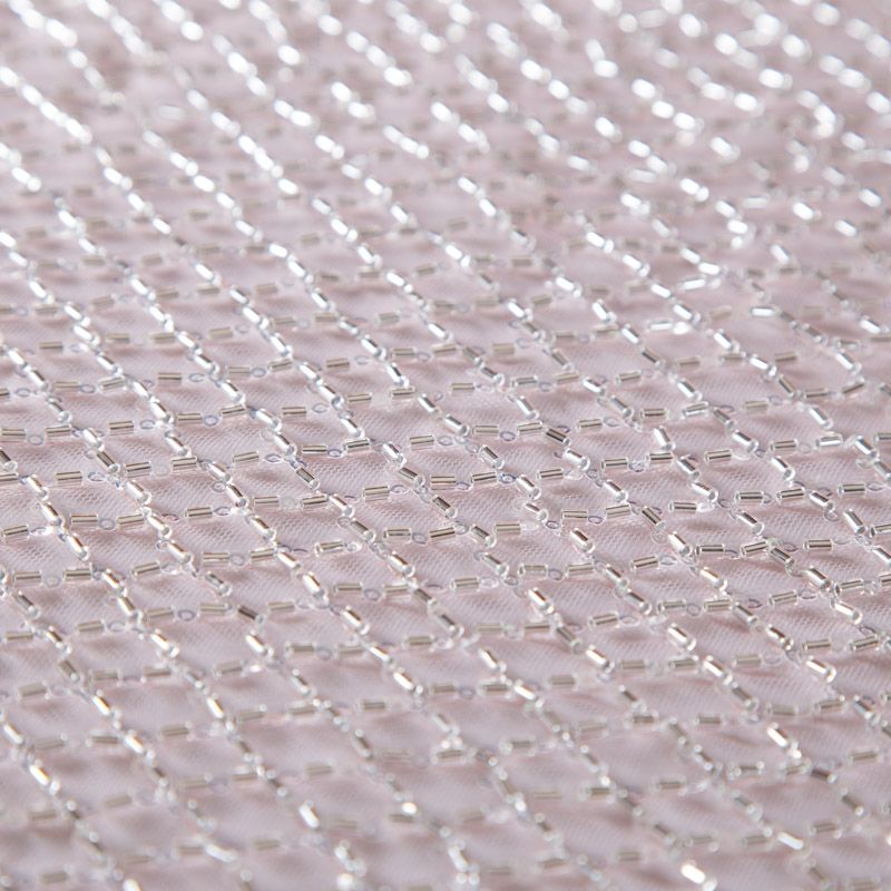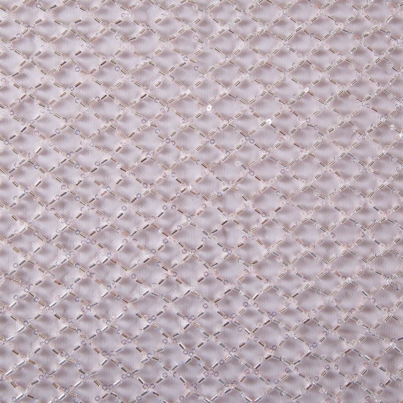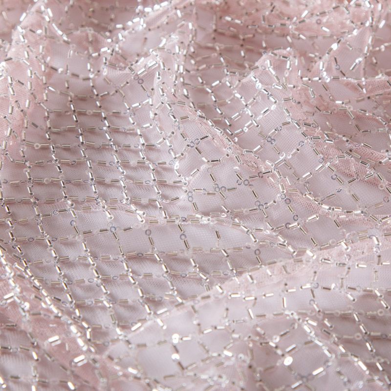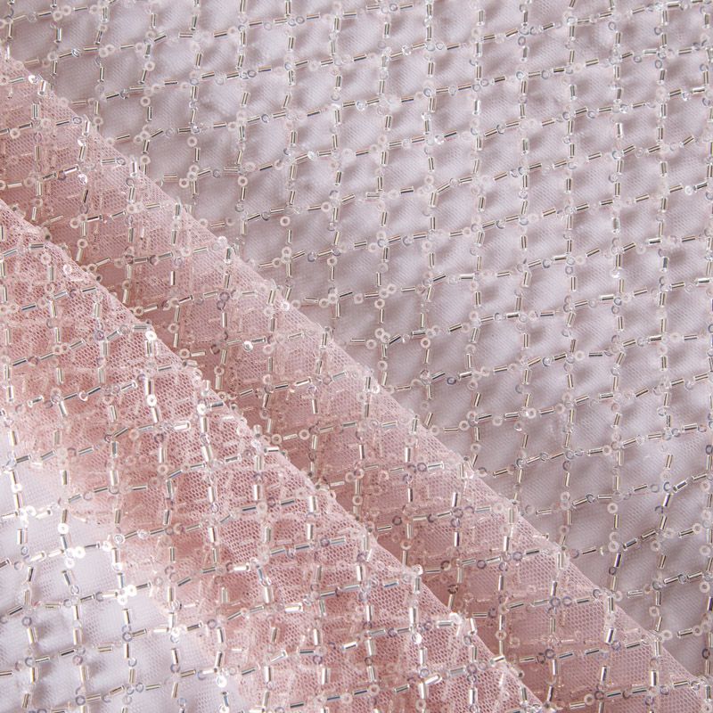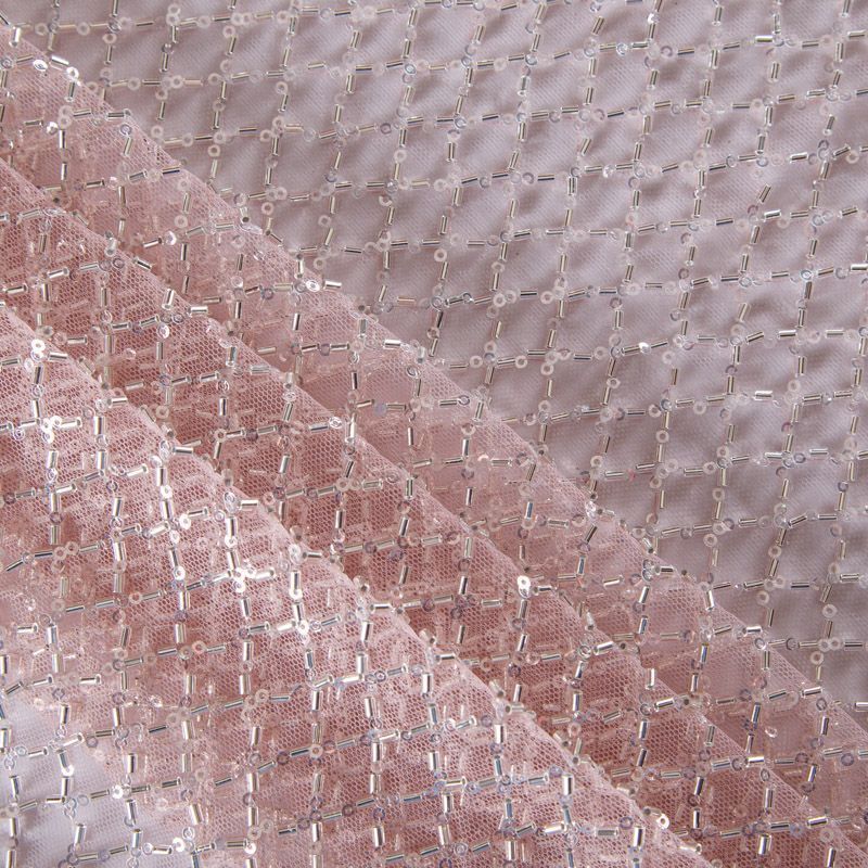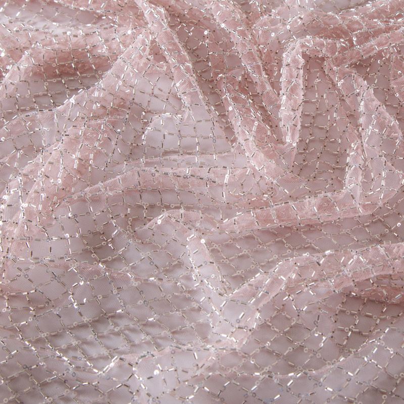 Эластичная мягкая сетка пудрового оттенка, расшитая стеклярусом и пайетками в тон основы. Геометрический дизайн делает полотно универсальным в использовании. Итальянская сетка прекрасно подходит для пошива праздничных нарядов, платьев, юбок и топов для торжественных случаев, а также отделки аксессуаров.