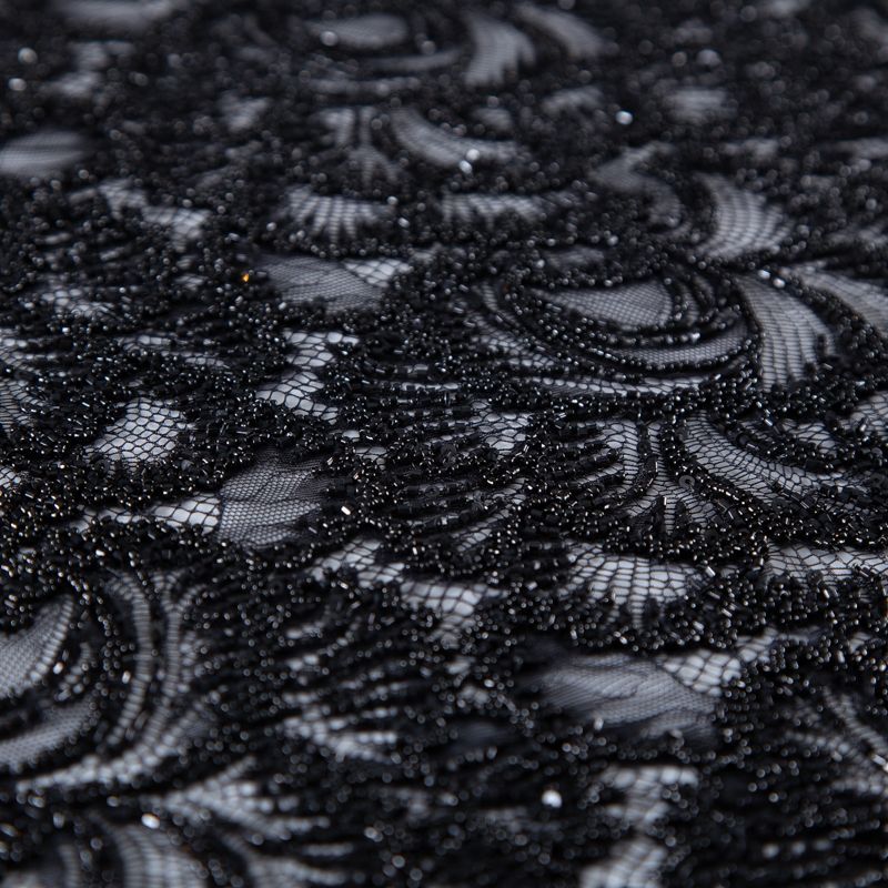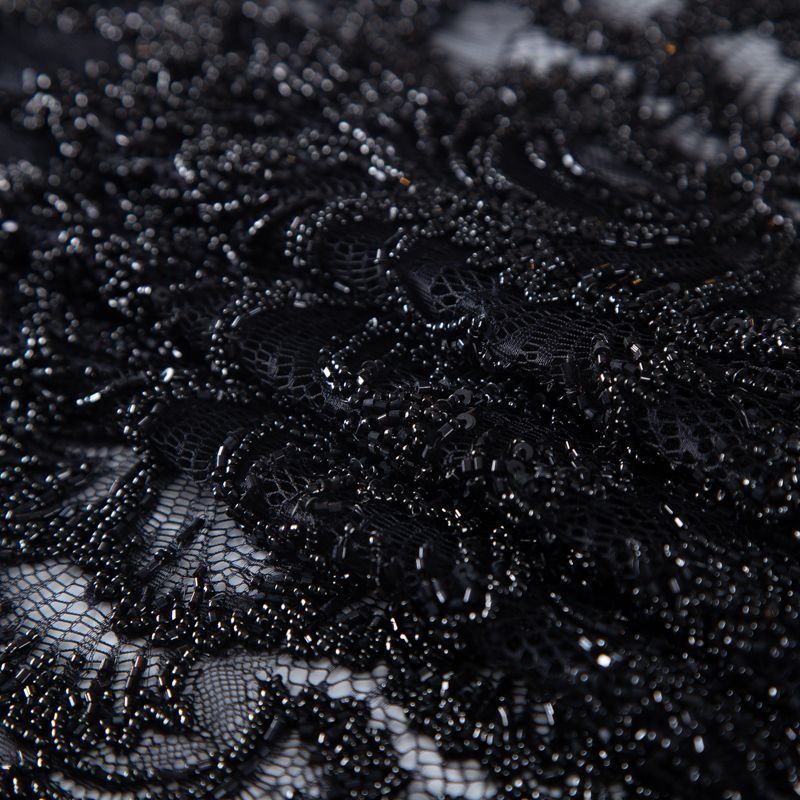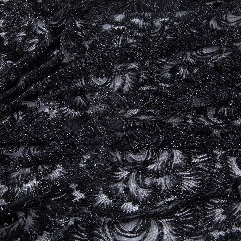 Нежнейшее итальянское кружево с насыщенной вышивкой по всему полотну. Мерцание цветочному узору придает нашитый стеклянный черный глянцевый бисер. Край полотна - фестон с "ресничками". Набирается на изделие объемом.