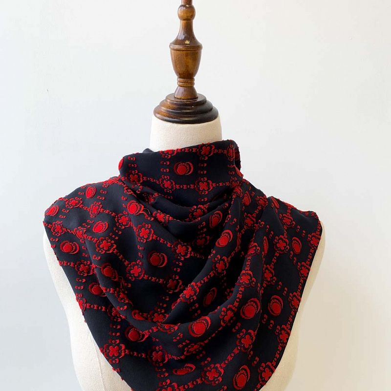 Шарф выполнен из итальянского жаккардового шелка с набивным узором красного цвета. Не прозрачный, хорошо драпируется, пластичный. Универсальный черный цвет одинаково элегантно будет смотреться и весной и летом, и с блузкой и с тренчем.