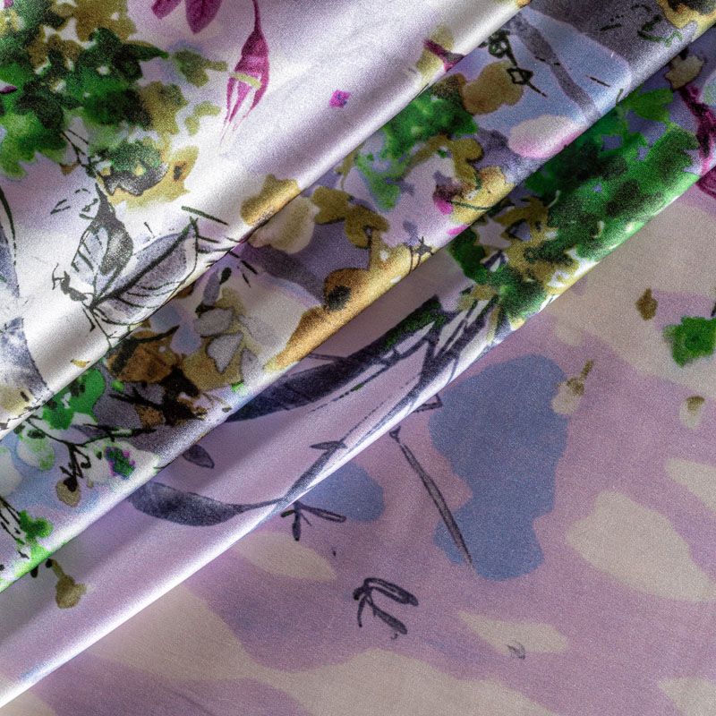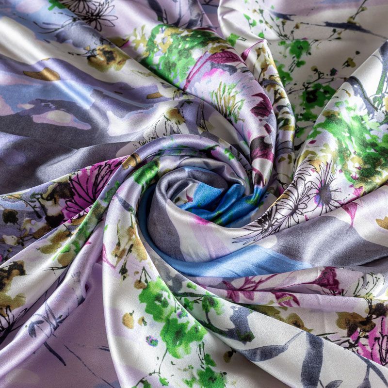 Итальянский атласный шелк с цветным растительным принтом. Вдоль кромки оформлен абстрактными полосками в тон рисунку. Можно использовать в изделии по длине ткани и объемом. Ткань средней плотности, не просвечивает, струится, хорошо драпируется. Поверхность глядкая, имеет благородный сатиновый блеск. Подойдет для смелых образов: летних платьев и сарафанов, как летящих фасонов, так и скроенных по косой, накидок, юбок, блузок, костюмов, широких брюк, домашней одежды.