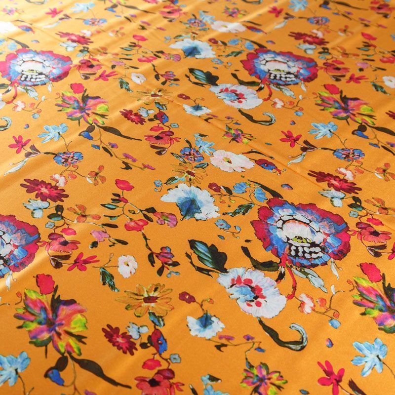 Итальянский атласный шелк со стилизованным цветочным принтом на ярком фоне. Ткань тонкая, не просвечивает, отлично драпируется, легкая и струящаяся, тянется за счет эластана в составе. Идеально подойдет для пошива платьев и сарафанов расклешенных моделей, с воланами, летящих юбок, топов, блузки, костюма в пижамном стиле.