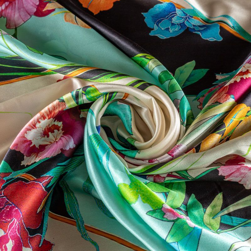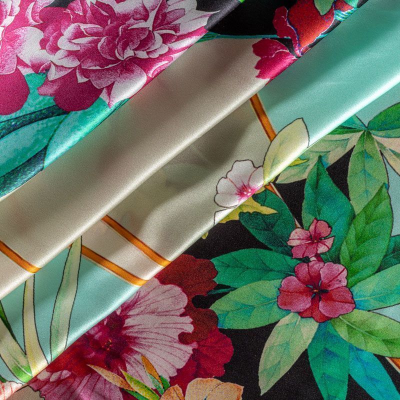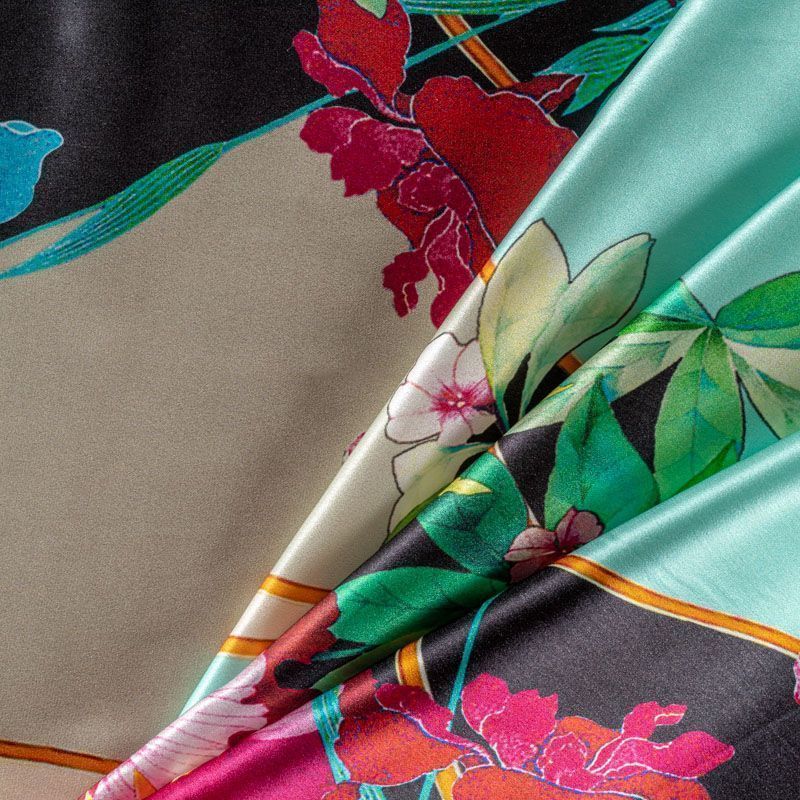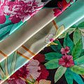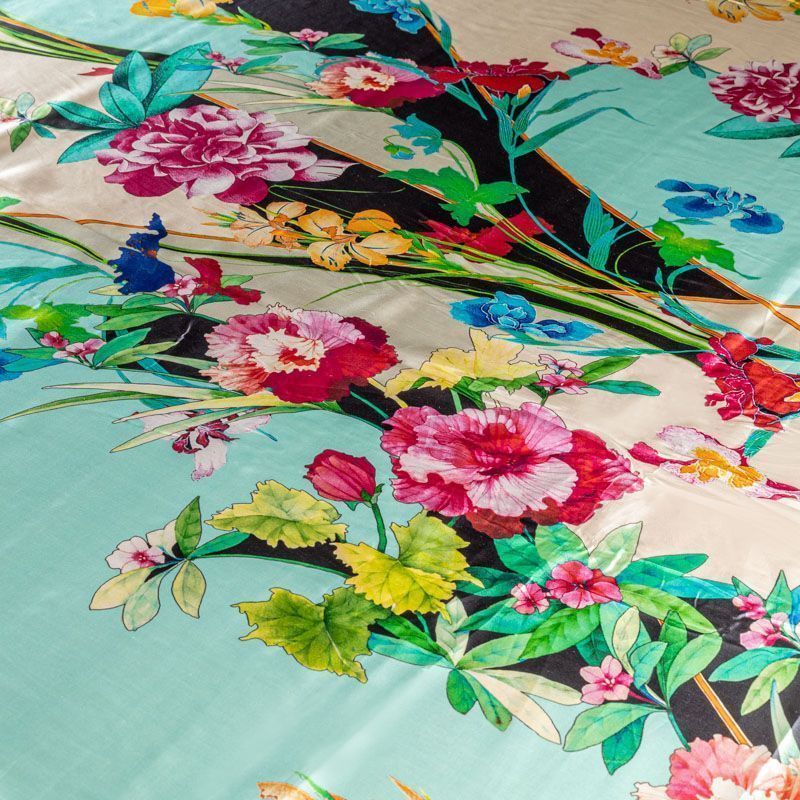 Итальянский атласный шелк с красивым ярким цветочным принтом. Ткань средней плотности, не просвечивает, струится, хорошо драпируется. Поверхность глядкая, имеет благородный сатиновый блеск. Подойдет смелых образов: летних платьев и сарафанов, как летящих фасонов, так и скроенных по косой, накидок, юбок, блузок, костюмов, широких брюк, домашней одежды.