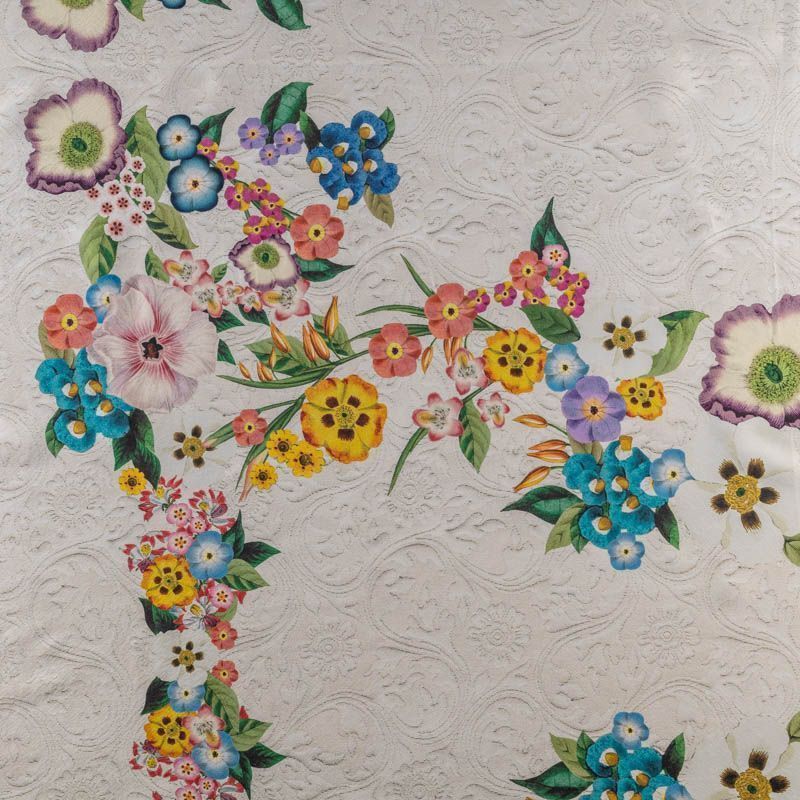 Итальянский атласный шелк с ярким цветочным принтом на фоне, имитурующем жаккардовый узор. Ткань средней плотности, не просвечивает, струится, хорошо драпируется. Поверхность гляпдкая, имеет благородный сатиновый блеск.  Подойдет для летних платьев накидок, юбок, блузок, костюмов, широких брюк, домашней одежды.