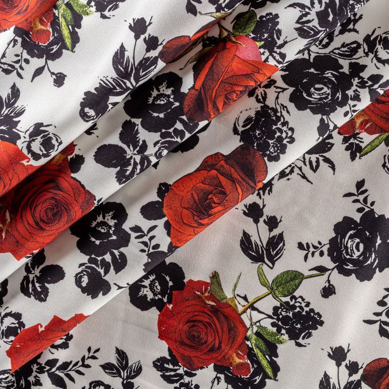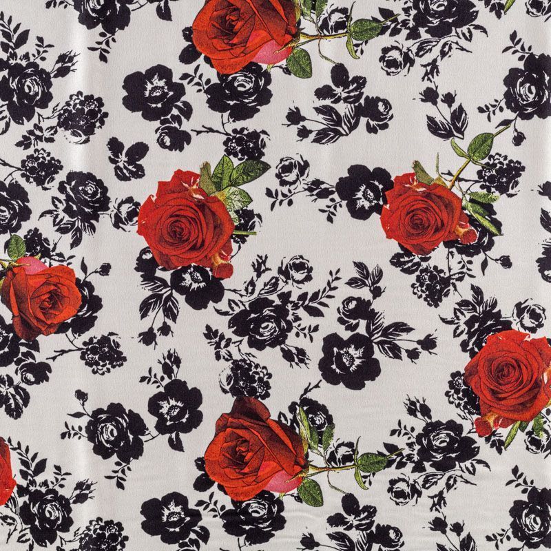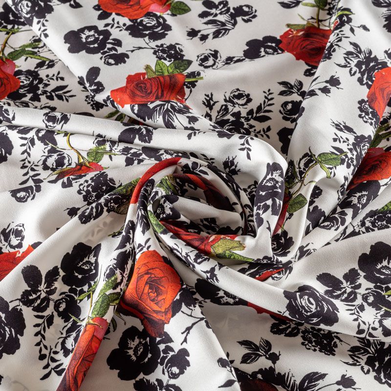 Итальянский матовый шелк с монохромный принтом и яркими акцентами на белом фоне, тонкий, слегка прозрачный, отлично драпируется, легкий и струящийся. Идеально подойдет для пошива платьев и сарафанов расклешенных моделей, с воланами, рюшами, летящих юбок, топов, блузки, рубашки, костюма в пижамном стиле.