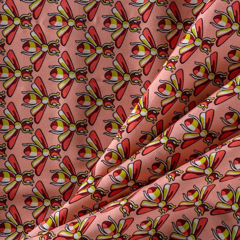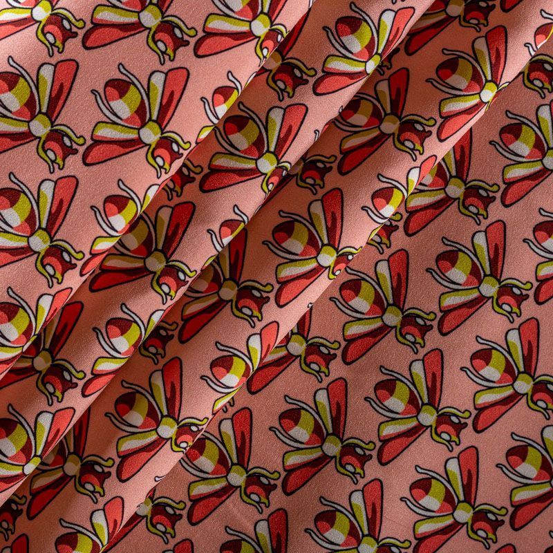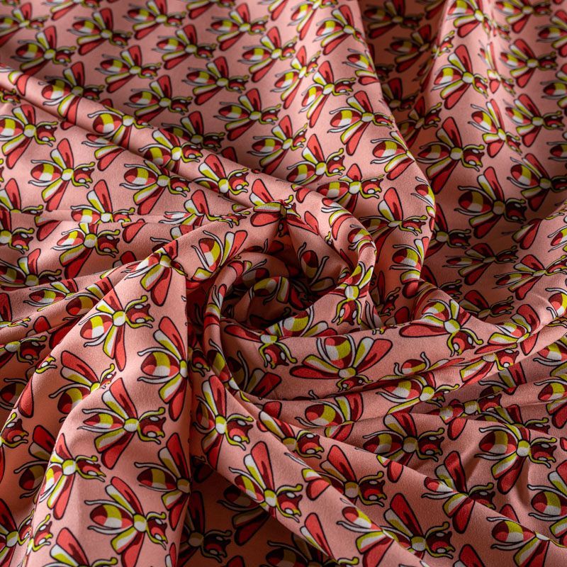 Итальянский матовый шелк розового оттенка с узнаваемым принтом от известного бренда. Ткань тонкая, не просвечивается, отлично драпируется, легкая и струящаяся, тянется за счет эластана в составе, лицевая сторона креповая, изнанка - атласная. Идеально подойдет для пошива платьев и сарафанов расклешенных моделей, с воланами, рюшами, летящих юбок, топов, блузки, рубашки, костюма в пижамном стиле.