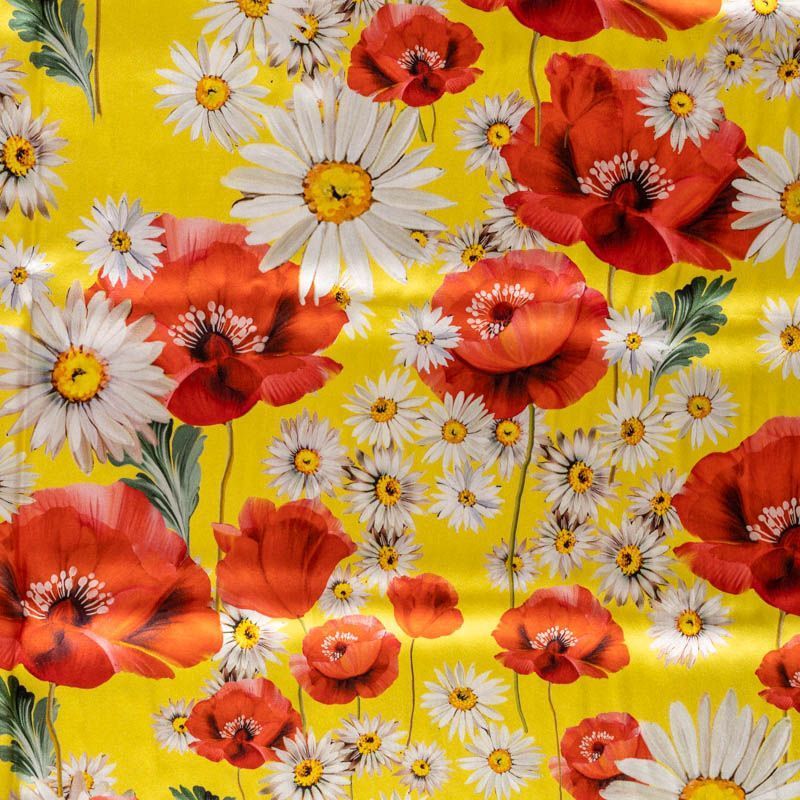 Итальянский атласный шелк, дизайн которого вдохновлен образом из коллекции известного бренда. На солнечном теплом фоне здесь - лаконичный и очень летний рисунок в виде ромашек и красных маков. Ткань средней плотности, не просвечивает, струится, хорошо драпируется. Поверхность глядкая, имеет благородный сатиновый блеск. Подойдет для летних платьев, накидок, юбок, блузок, костюмов, широких брюк, домашней одежды.