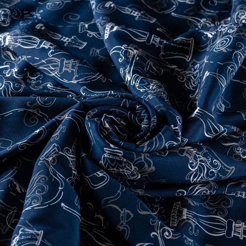 Итальянский матовый шелк насыщенного темно-синего оттенка с узнаваемым принтом. Ткань тонкая, не просвечивается, отлично драпируется, легкая и струящаяся, тянется за счет эластана в составе, лицевая сторона креповая, изнанка - атласная. Идеально подойдет для пошива платьев и сарафанов расклешенных моделей, с воланами, рюшами, летящих юбок, топов, блузки, рубашки, костюма в пижамном стиле.