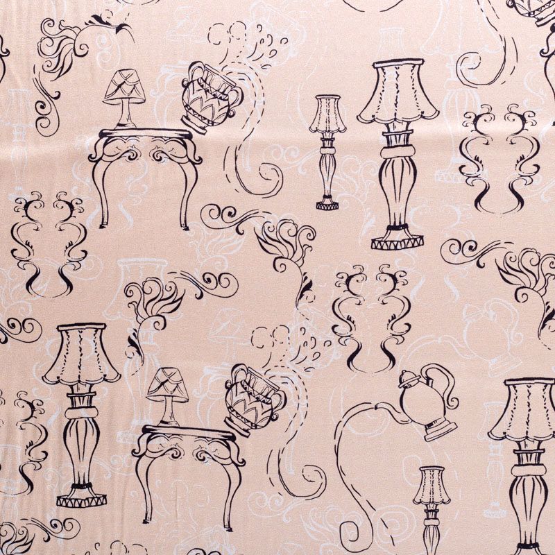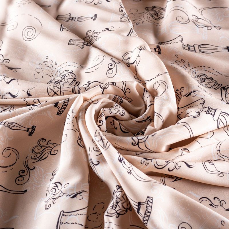 Итальянский матовый шелк бежевого оттенка с узнаваемым принтом. Ткань тонкая, не просвечивается, отлично драпируется, легкая и струящаяся, тянется за счет эластана в составе, лицевая сторона креповая, изнанка - атласная. Идеально подойдет для пошива платьев и сарафанов расклешенных моделей, с воланами, рюшами, летящих юбок, топов, блузки, рубашки, костюма в пижамном стиле.