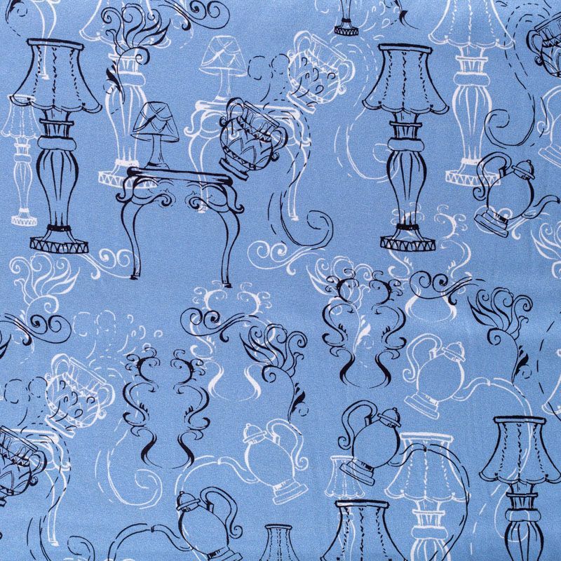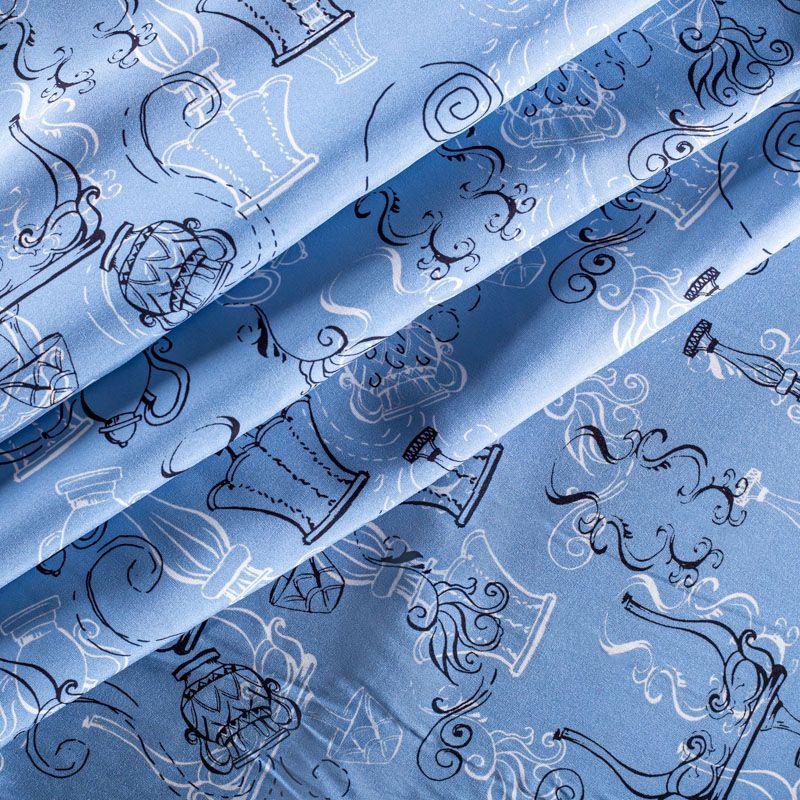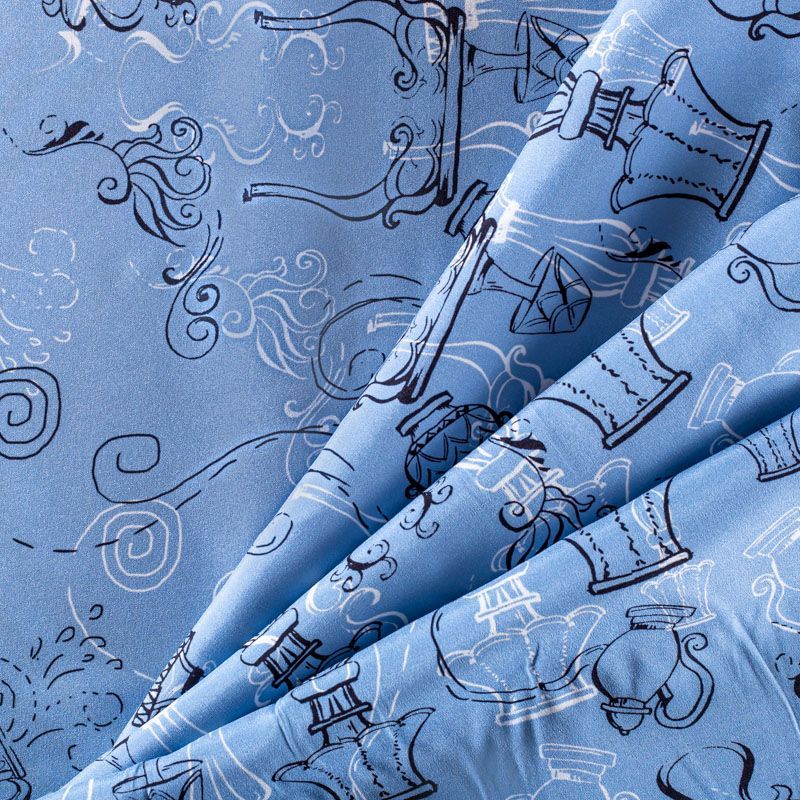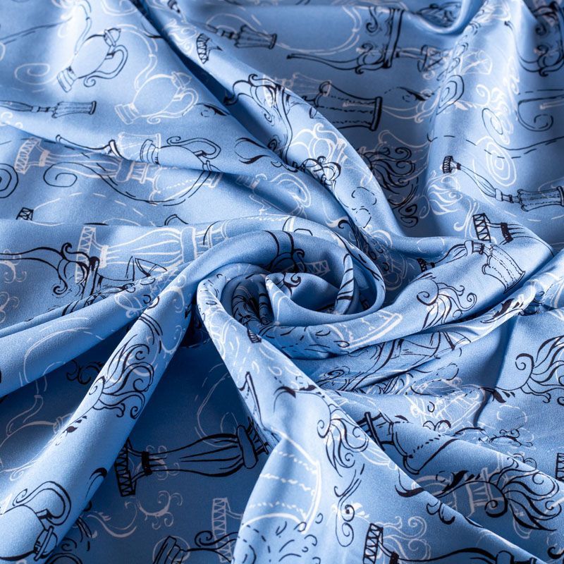 Итальянский матовый шелк холодного голубого оттенка с узнаваемым принтом. Ткань тонкая, не просвечивается, отлично драпируется, легкая и струящаяся, тянется за счет эластана в составе, лицевая сторона креповая, изнанка - атласная. Идеально подойдет для пошива платьев и сарафанов расклешенных моделей, с воланами, рюшами, летящих юбок, топов, блузки, рубашки, костюма в пижамном стиле.