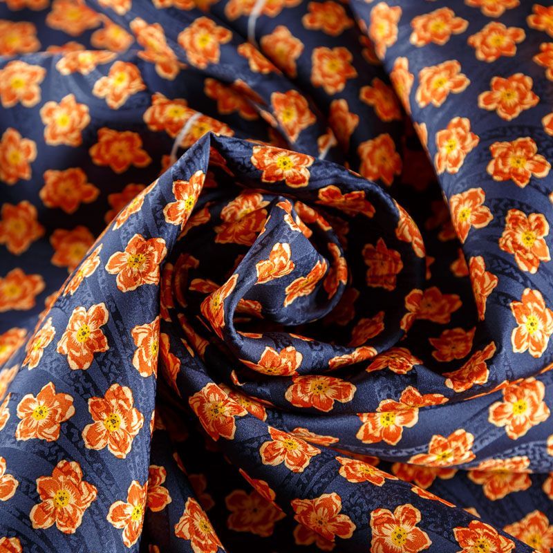 Итальянский матовый жаккардовый шелк с ярким цветочным принтом. Ткань средней плотности, не просвечивает, струится, хорошо драпируется. Поверхность глядкая, имеет благородный сатиновый блеск. Подойдет смелых образов: летних платьев и сарафанов, как летящих фасонов, так и скроенных по косой, накидок, юбок, блузок, костюмов, широких брюк, домашней одежды.