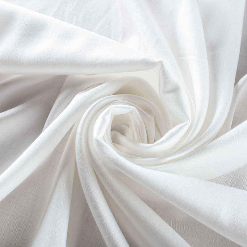 Плательно-блузочный штапель с добавлением шелка молочного оттенка. Мягкий, нежный, пластичный, шелковистый на ощупь, хорошо драпируется, тянется за счет эластана в составе. Особенно актуален летом, он очень легкий, обволакивающий прохладой. Идеален для пошива летней детской одежды, сарафанов, платьев, юбок, блузок, домашней одежды: халатов, ночной пижамы.