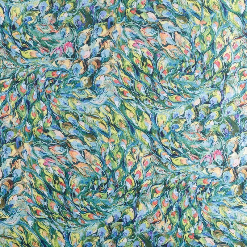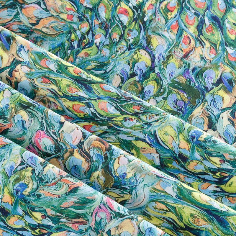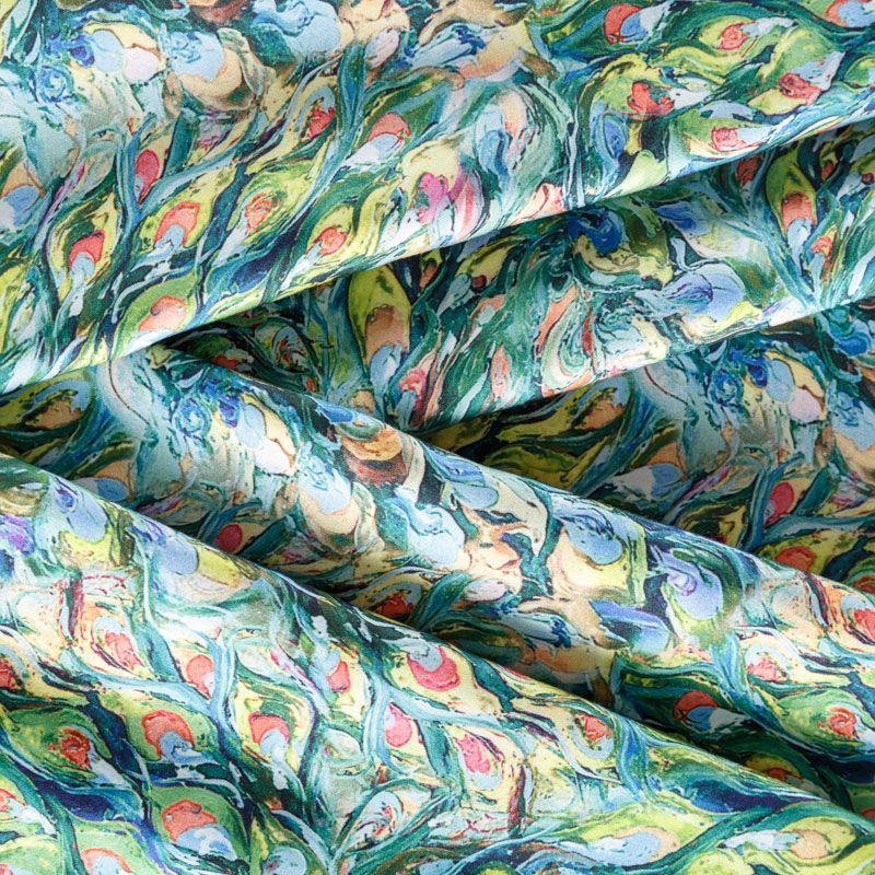 Плательно-блузочный штапель с добавлением шелка зеленого оттенка с цветным абстрактным акварельным принтом. Мягкий, нежный, пластичный, шелковистый на ощупь, хорошо драпируется, практичный. Особенно актуален летом, он очень легкий, обволакивающий прохладой. Идеален для пошива летней детской одежды, сарафанов, платьев, юбок, блузок, домашней одежды: халатов, ночной пижамы.
