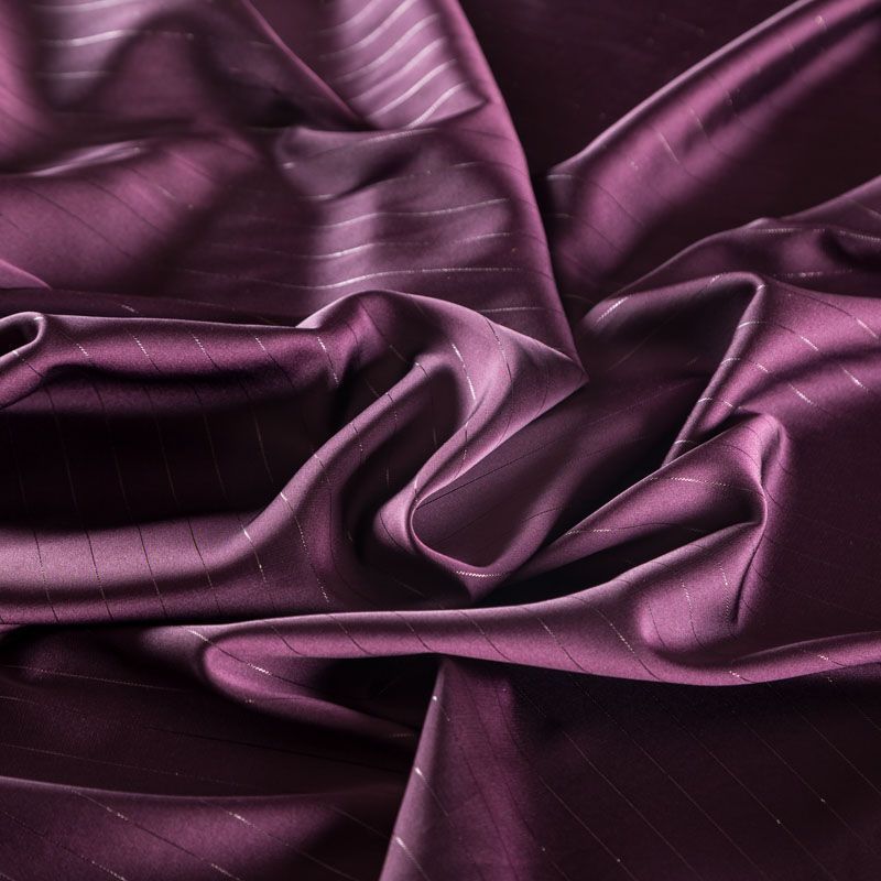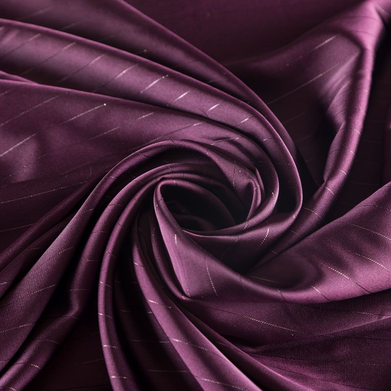 Тонкая, легкая, струящаяся ткань, декорированная тонкими вертикальными полосками люресовой нити, не просвечивает, очень нежная и прятная к телу, обладает благородным атласным блеском, хорошо драпируется, тянется за счет эластана в составе. Идеально подойдет для пошива блузок, платьев и юбок, а также топов, платков, домашней одежды.