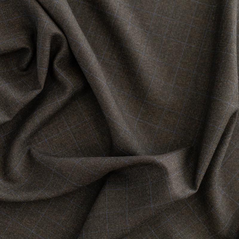 Костюмно-плательная итальянская шерсть средней плотности, не много суховата на ощупь, при этом очень хорошо драпируется и ниспадает. Очень теплая, уютная, не колется, в носке очень комфортная. Тонкая голубая полоска, образующая клетку, освежает и облагораживает сдержанный серо-коричневый фон ткани. Подойдет для пошива стильного платья прямого или расклешенного силуэта для сезона осень-зима, юбок, костюмов, жакетов, брюк.