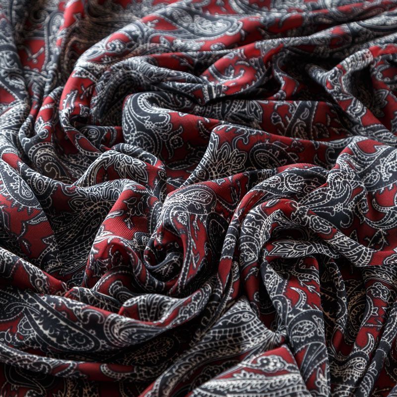 Шифон бордового оттенка с черно-белым принтом пейсли. Струящийся, летящий, воздушный, полупрозрачный. На ощупь мягкий и приятный. Подойдет для пошива тончайших воздушных блуз, изумительных платьев со сборками и воланами и элегантных шарфов.