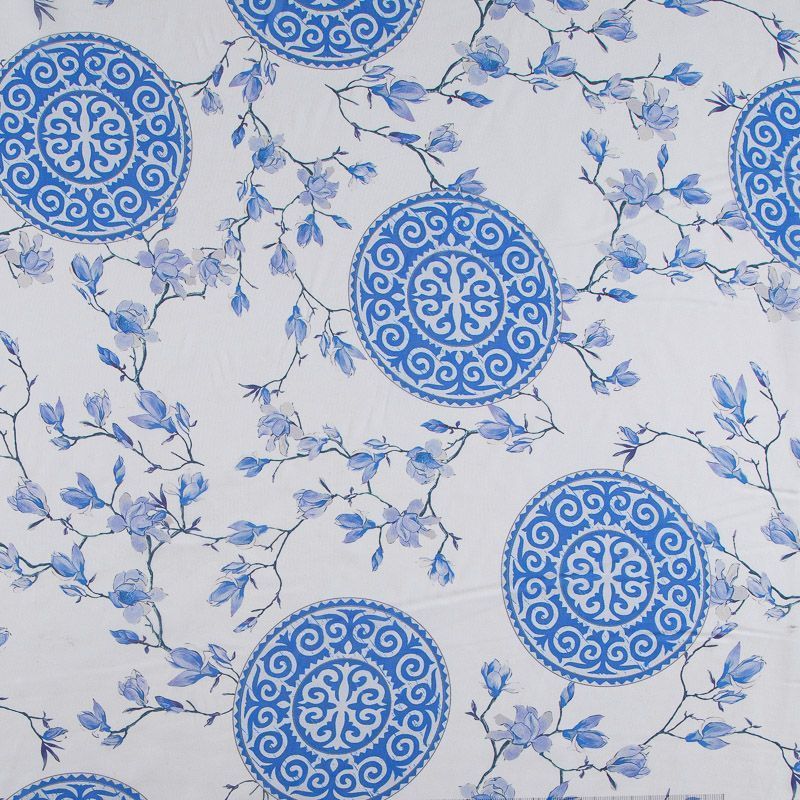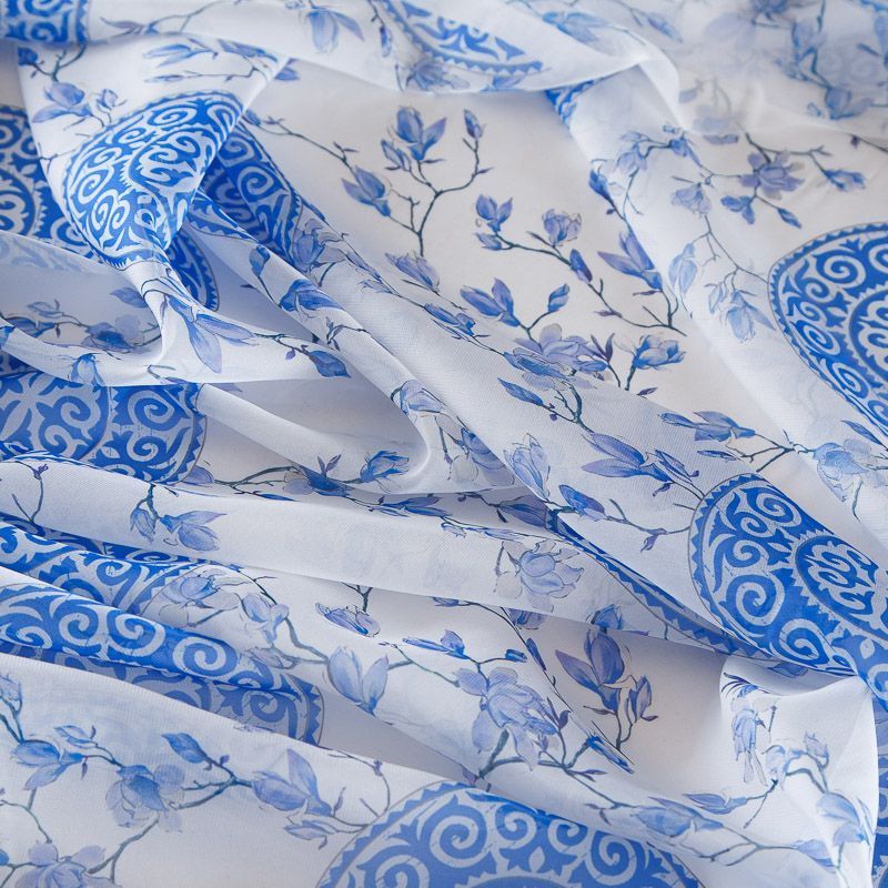 Воздушный, летящий, эффектный шифон в бело-голубых оттенках. Принт очень женственный и нежный. Ткань матовая, мягкая, пластичная, не тянется, достаточно прозрачная, не статичная.