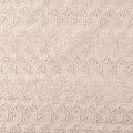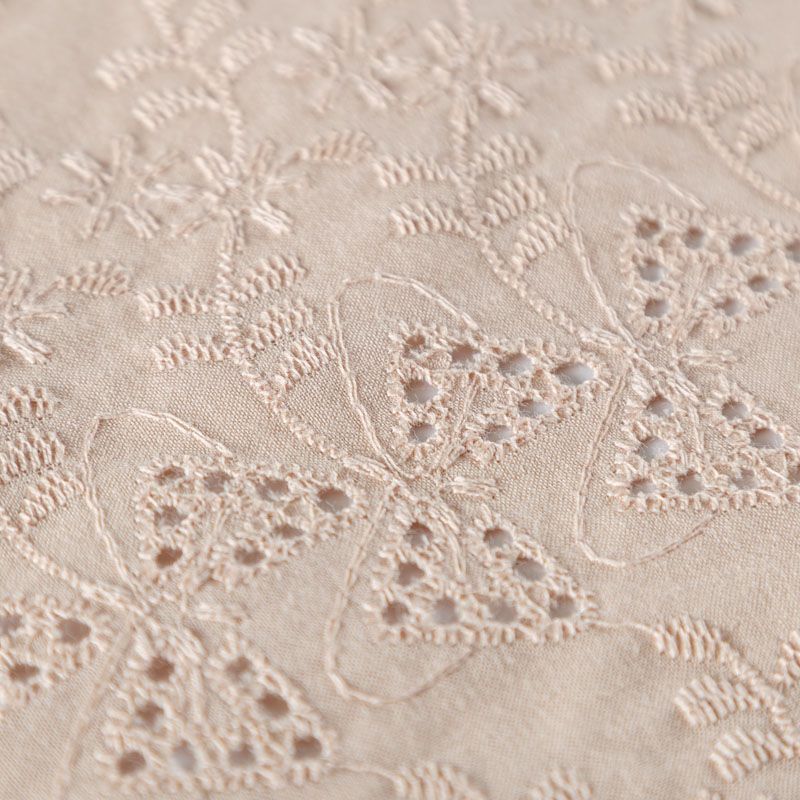 Мягкий и нежный хлопок бежевого оттенка с вышивкой и перфорацией. Узор выполнен путём машинной вышивки нитками в цвет ткани и расположен по всему полотну, обе кромки оформлены фестонами. Фактура ткани однородная, имеет тенденцию к сминаемости, не тянется, приятная на ощупь. Может потребоваться подклад. Идеально подходит для создания летних платьев, сарафанов, юбок, блузок и топов.