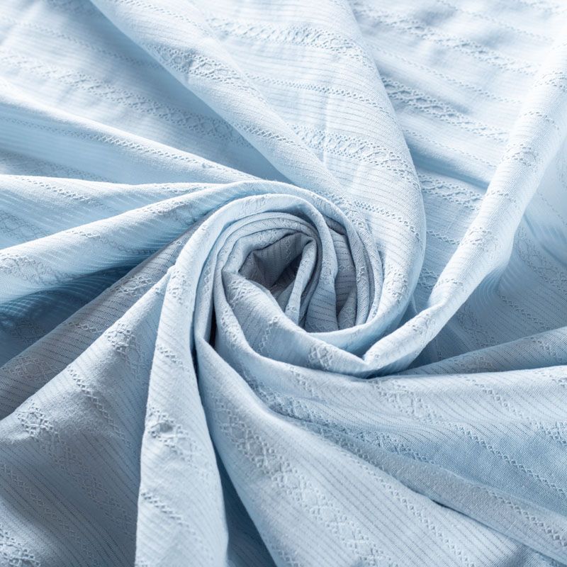 Мягкий и нежный итальянский хлопок выбеленного голубого оттенка с изящной вышивкой. Узор выполнен путём машинной вышивки нитками в цвет ткани и расположен вдоль кромки. Фактура ткани неоднородная, имеет тенденцию к сминаемости, не много просвечивает, не тянется, приятная на ощупь. Идеально подходит для создания летних платьев, сарафанов, юбок, блузок и топов.