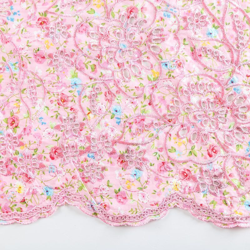 Мягкий и нежный хлопок розового оттенка с мелким романтичным цветочным принтом украшен изящной вышивкой и перфорацией.  Узор выполнен путём машинной вышивки нитками в цвет ткани и расположен вдоль одной кромки, поэтому набирается на изделие объемом. Ткань тонкая, легкая, не сухая, имеет тенденцию к сминаемости, не много просвечивает, не тянется, приятная на ощупь. Идеально подходит для создания летних платьев, сарафанов, юбок, блузок, топов, шорт.