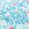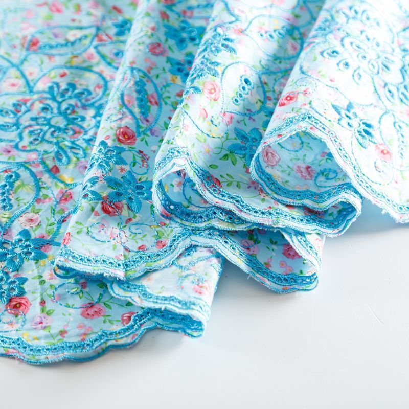 Мягкий и нежный хлопок голубого оттенка с мелким романтичным цветочным принтом украшен изящной вышивкой и перфорацией. Узор выполнен путём машинной вышивки нитками в цвет ткани и расположен вдоль одной кромки, поэтому набирается на изделие объемом. Ткань тонкая, легкая, не сухая, имеет тенденцию к сминаемости, не много просвечивает, не тянется, приятная на ощупь. Идеально подходит для создания летних платьев, сарафанов, юбок, блузок, топов, шорт.