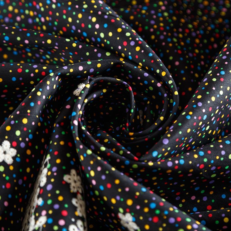 Мягкий и нежный хлопок черного цвета с мелким цветным принтом принтом украшен контрастной вышивкой. Узор выполнен путём машинной вышивки и расположен вдоль одной кромки, образуя фестон, поэтому набирается на изделие объемом. Ткань легкая, не сухая, хорошо драпируется и держит форму, имеет тенденцию к сминаемости, не просвечивает, не тянется, приятная на ощупь. Идеально подходит для создания летних платьев, сарафанов, юбок, блузок, топов, шорт.