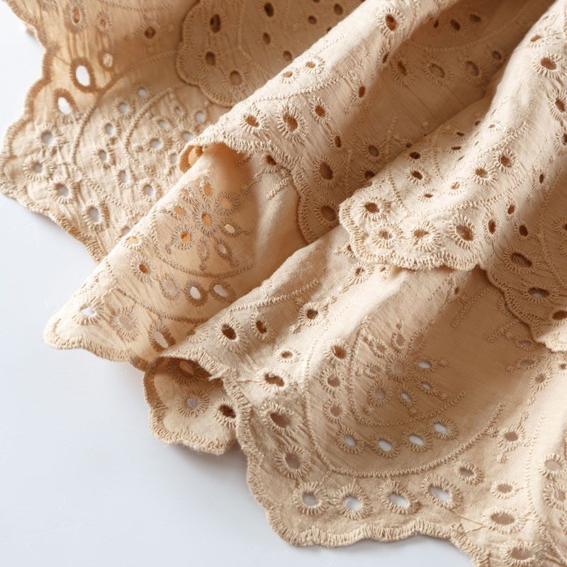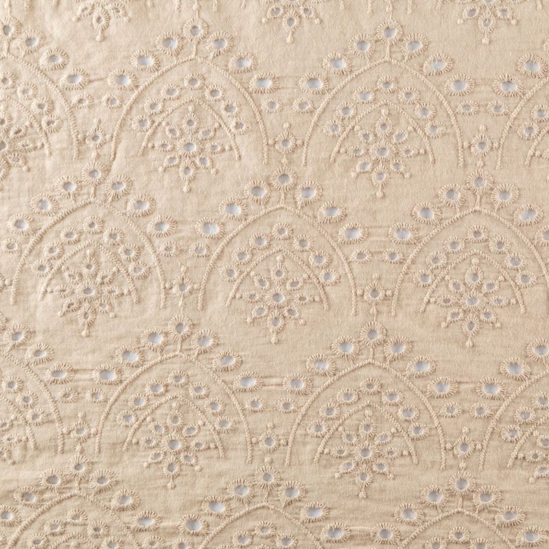Итальянское шитье на бежевой хлопковой основе с геометрической, элегантной вышивкой, расположеннной по всему полотну. Ткань мягкая, легкая, пластичная, приятная на ощупь, просвечивает, потребуется подклад. Обе кромки ткани оформлены фигурными фестонами. Идеально подойдет для пошива рубашки, блузы, топа в воланами, туники, платья, сарафана, юбки, шорт.