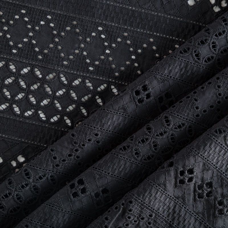 Мягкий и нежный хлопок черного цвета с изящной вышивкой и перфорацией.  Узор выполнен путём машинной вышивки нитками в цвет ткани и расположен вдоль кромки. Фактура ткани неоднородная, имеет тенденцию к сминаемости, не много просвечивает, не тянется, приятная на ощупь. Идеально подходит для создания летних платьев, сарафанов, юбок, блузок, топов, шорт.