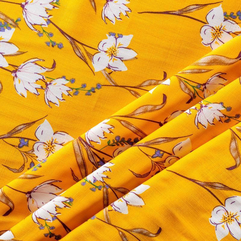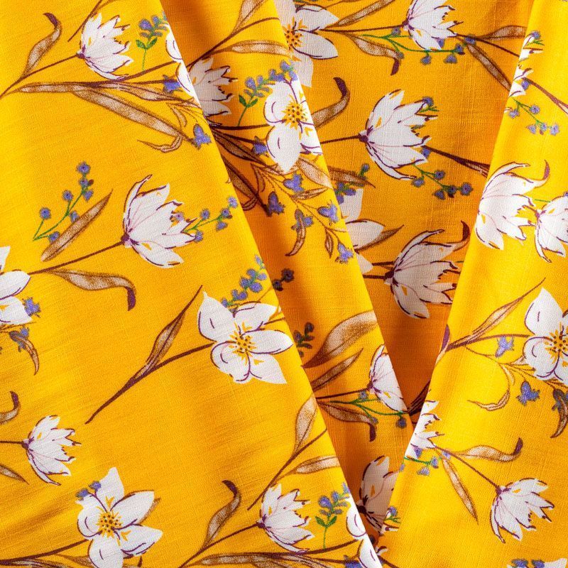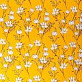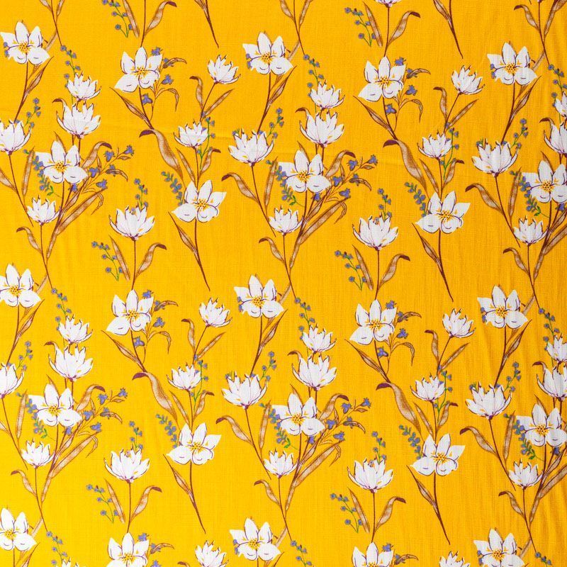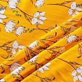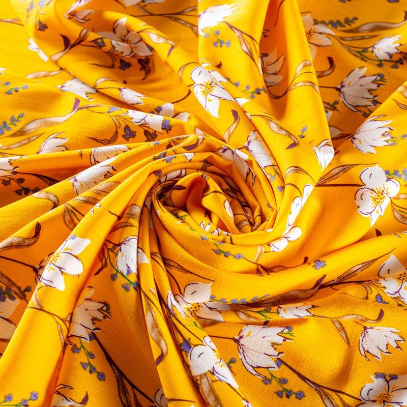 Плательно-блузочный штапель с цветочным принтом на шафрановом фоне. Мягкий, тонкий, нежный, пластичный, приятный на ощупь, хорошо драпируется, практичный. Подойдет для пошива платья, топа, блузки, рубашки, юбки, летних брюк.