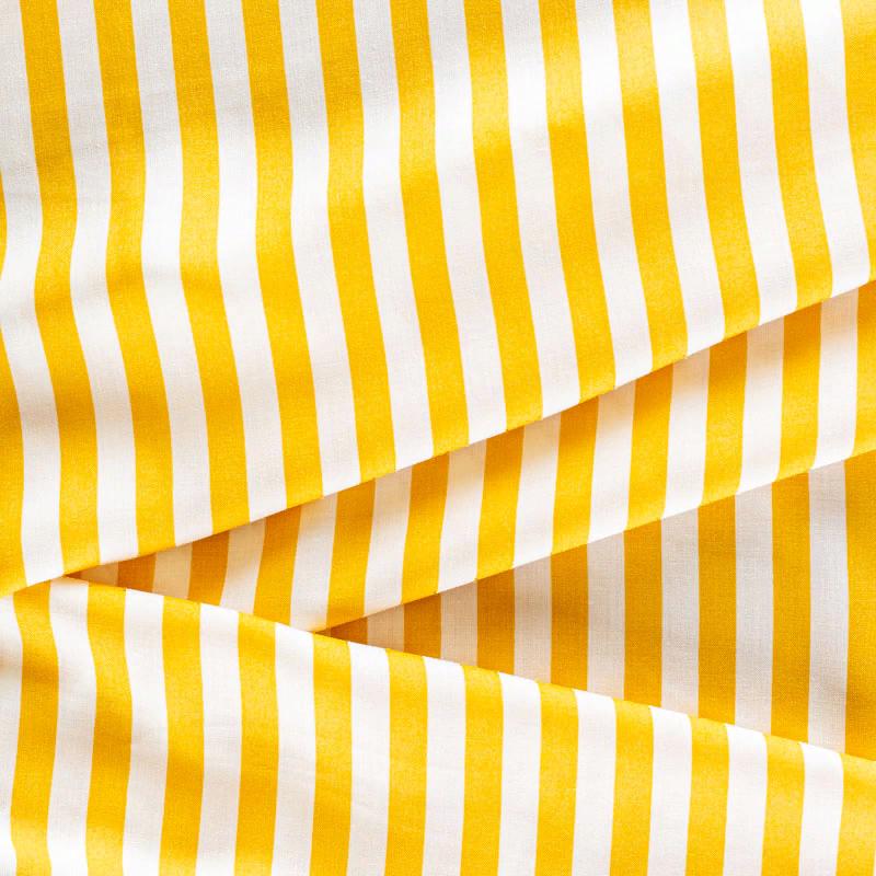 Плательно-блузочный штапель в вертикальную полоску средней ширины яркого желтого цвета. Ткань мягкая, тонкая, нежная, пластичная, приятная на ощупь, хорошо драпируется, практичная, поверхность слегка фактурная. Подойдет для пошива платья, топа, блузки, рубашки, юбки, летних брюк.