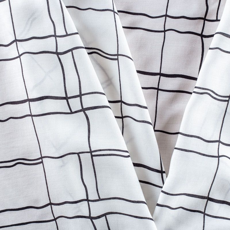 Плательно-блузочный штапель с геометрическим принтом, образующим клетку, на белом фоне. Мягкий, тонкий, нежный, пластичный, приятный на ощупь, хорошо драпируется, практичный. Подойдет для пошива платья, топа, блузки, рубашки, юбки, летних брюк.