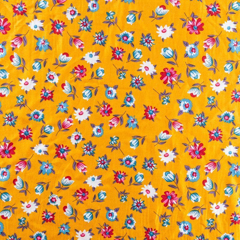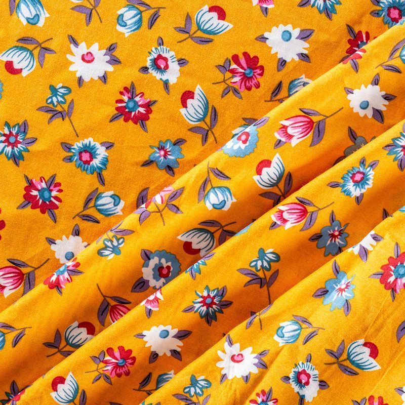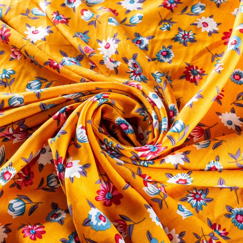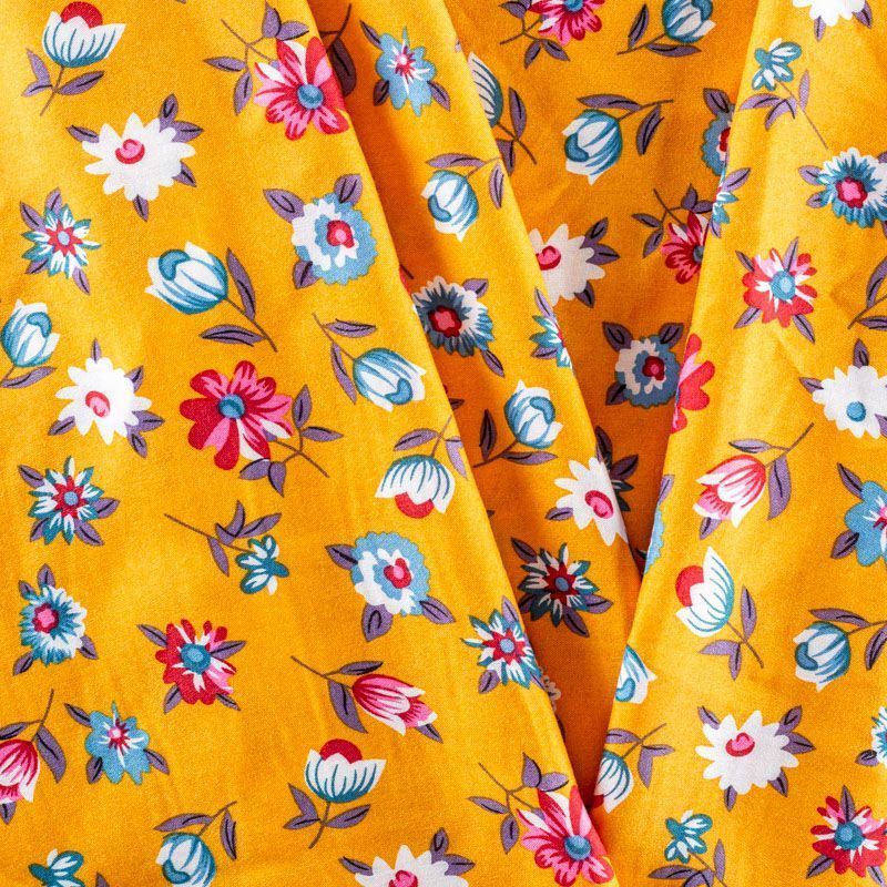 Плательно-блузочный штапель с цветочным принтом на желтом фоне. Мягкий, тонкий, нежный, пластичный, приятный на ощупь, хорошо драпируется, практичный. Подойдет для пошива платья, топа, блузки, рубашки, юбки, летних брюк.