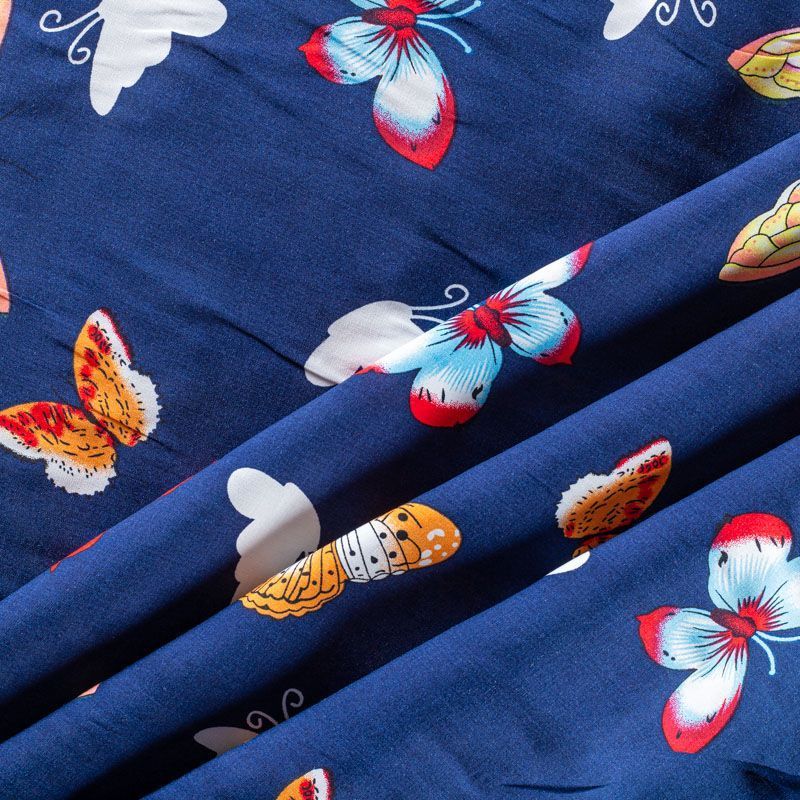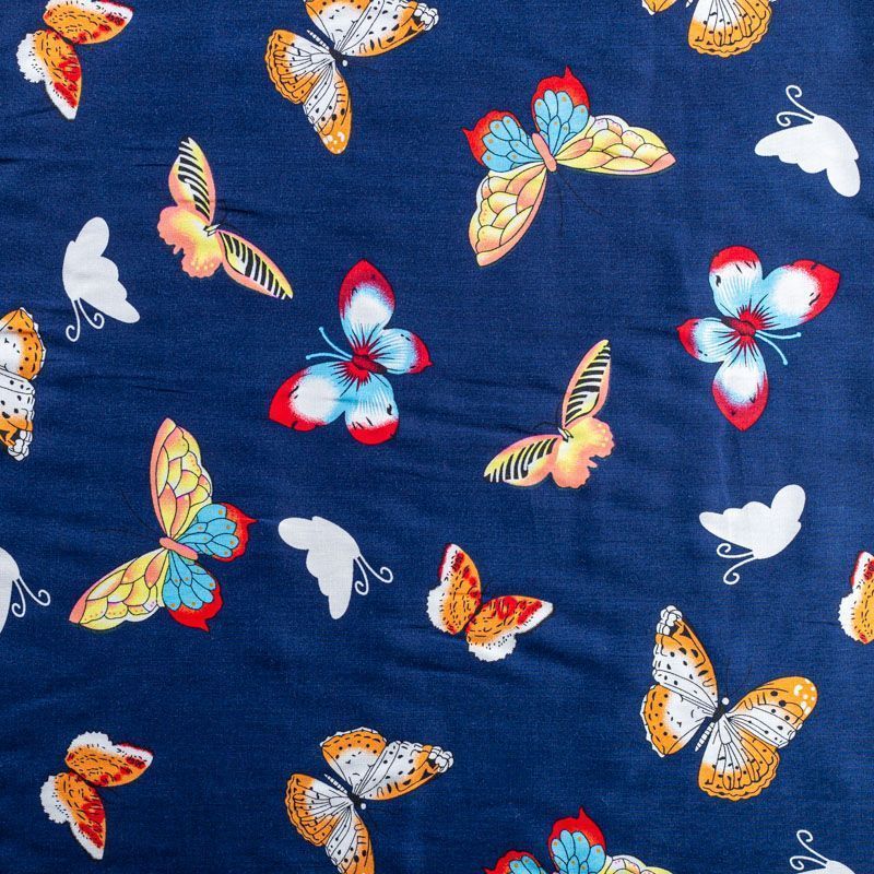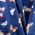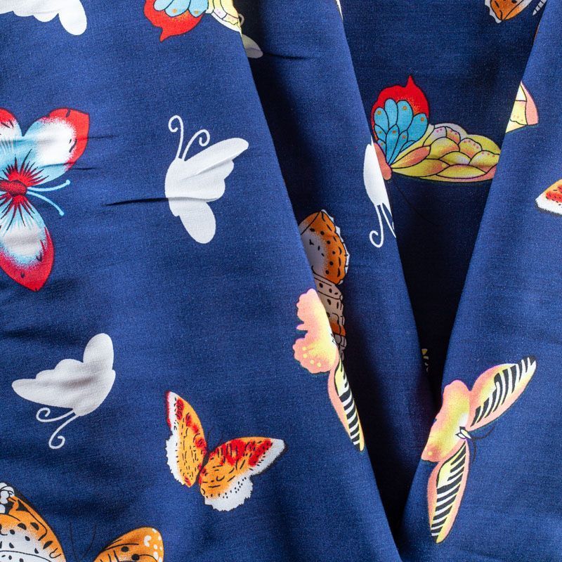 Плательно-блузочный штапель с романтичным принтом в виде цветных стилизованных бабочек на темно-синем фоне. Мягкий, тонкий, нежный, пластичный, приятный на ощупь, хорошо драпируется, практичный. Подойдет для пошива платья, топа, блузки, рубашки, юбки, летних брюк.