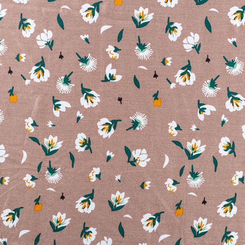 Плательно-блузочный штапель с цветочным принтом на пепельно-коричневом фоне. Мягкий, тонкий, нежный, пластичный, приятный на ощупь, хорошо драпируется, практичный. Подойдет для пошива платья, топа, блузки, рубашки, юбки, летних брюк.