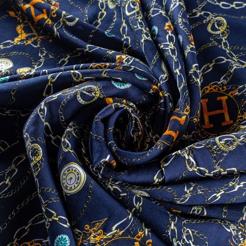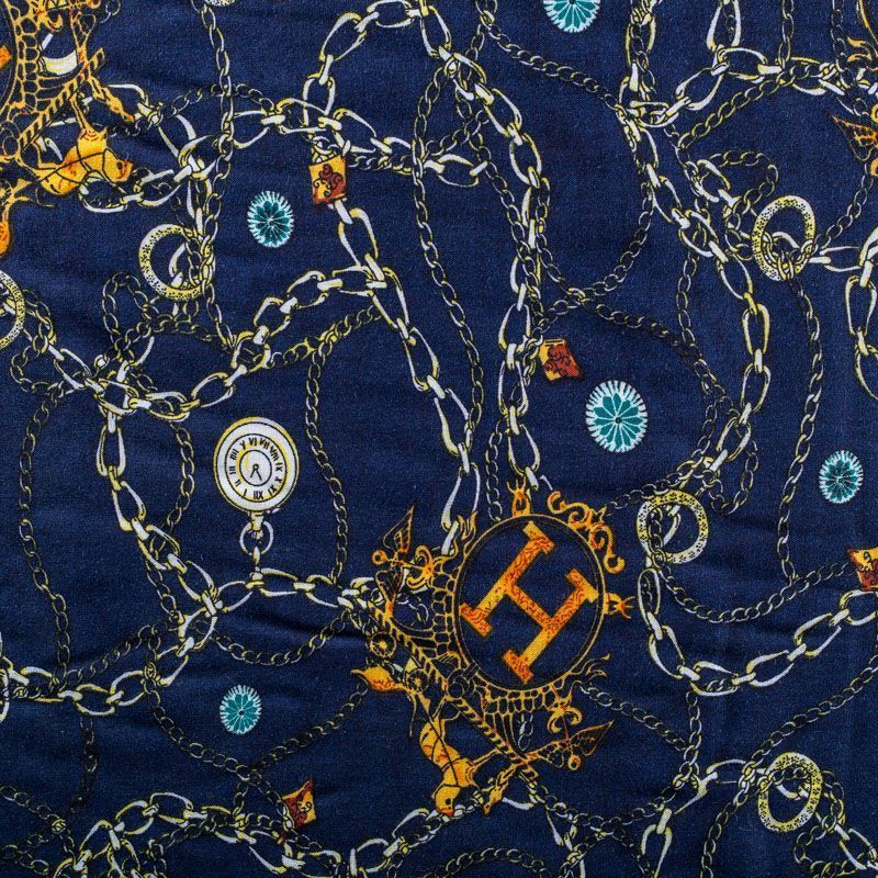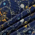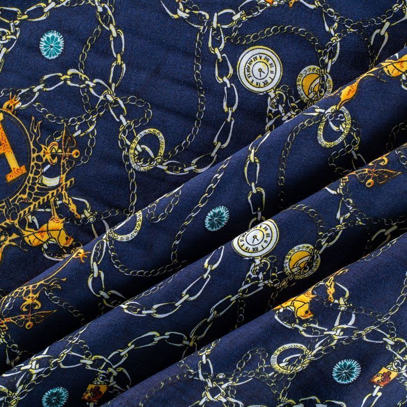 Плательно-блузочный штапель синего оттенка с многочисленными золотыми цепями, часами и украшениями. Ткань мягкая, тонкая, нежная, пластичная, приятная на ощупь, хорошо драпируется, практичная, поверхность слегка фактурная. Подойдет для пошива платья, топа, блузки, рубашки, юбки, летних брюк.