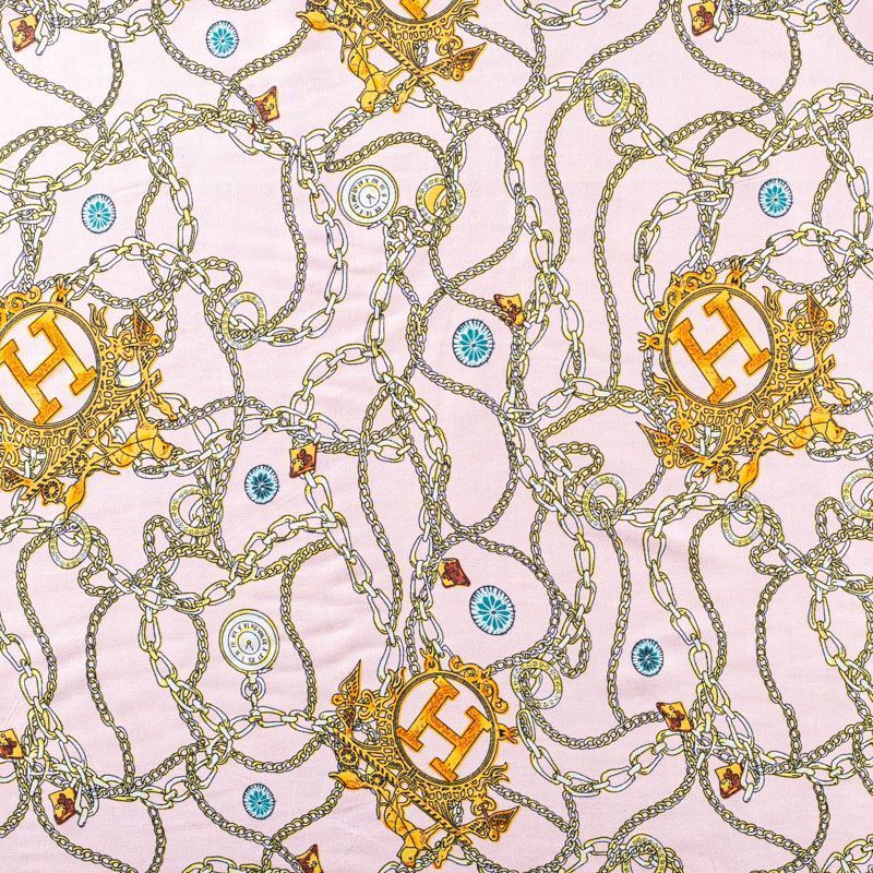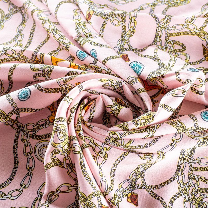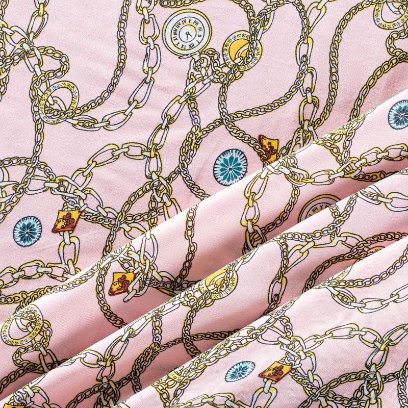 Плательно-блузочный штапель розового оттенка с многочисленными золотыми цепями, часами и украшениями. Ткань мягкая, тонкая, нежная, пластичная, приятная на ощупь, хорошо драпируется, практичная, поверхность слегка фактурная. Подойдет для пошива платья, топа, блузки, рубашки, юбки, летних брюк.