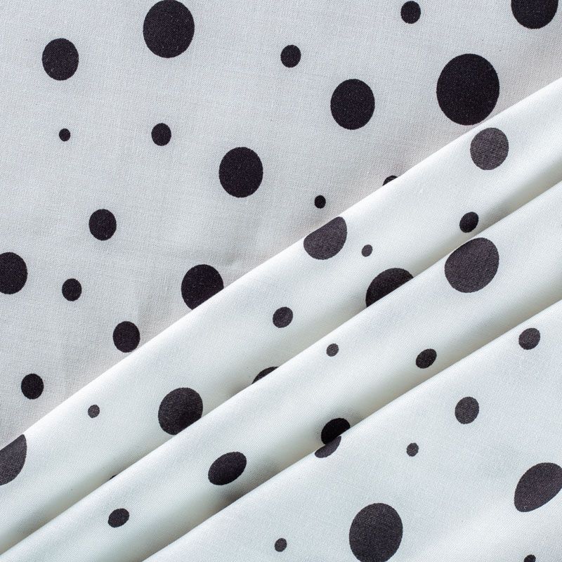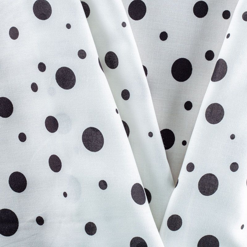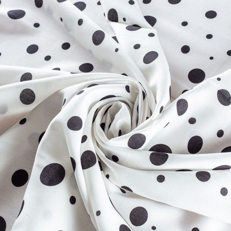 Плательно-блузочный штапель в черный разноразмерный горох на белом фоне. Мягкий, тонкий, нежный, пластичный, приятный на ощупь, хорошо драпируется, практичный. Подойдет для пошива платья, топа, блузки, рубашки, юбки, летних брюк.